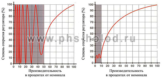 В данной схеме на нагнетательной линии после маслоотделителя установлен регулятор давления «до себя» Parker A4A. Задачей регулятора является поддержание в нагнетательной магистрали компрессоров и маслоотделителе давления не ниже прим. 10 Бар с целью снижения уноса масла в систему. Повышенный унос масла из маслоотделителя наблюдается при следующих режимах работы: — при запуске первого компрессора после стоянки и если при низкой температуре окружающей среды компрессор в течение относительно длительного времени не может создать достаточное давление в конденсаторе. Как показывает наш опыт эксплуатации, если первый компрессор запускается и через несколько секунд останавливается вследствие срабатывания какой-либо защитной цепи и если регулятор давления на нагнетательной линии не установлен, то через — при резком падении давления конденсации в случае включения вентиляторов конденсатора в зимний период или выключения одного или нескольких компрессоров, что ведет к вскипанию растворенного в масле хладагента из-за снижения давления в маслоотделителе. Для многокомпрессорных станций с большим (более 3 шт.) количеством компрессоров особо важное значение имеет возможность поддержания регулятором заданного давления в режиме частичной нагрузки, когда, например, работает только один из четырех или пяти компрессоров. Практически все выпускаемые в настоящее время регуляторы давления могут стабильно работать в диапазоне от 50 % до 100 % от номинальной производительности. При меньших нагрузках регулятор входит в режим пульсаций, т. е. начинает закрываться — открываться, т. к. при малом потоке паров его конструкция не позволяет точно реагировать на изменение давления на входе. Реагируя на снижение нагрузки, клапан регулятора перекрывает проход паров, затем перепад давления на регуляторе немного возрастает — клапан начинает быстро двигаться в обратном направлении, практически полностью открывая регулятор, а затем всё повторяется снова. Зависимость степени открытия регулятора от нагрузки для большинства регуляторов показана на графике 1.