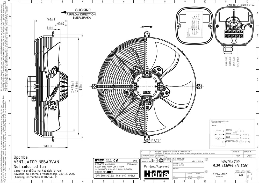 Осевые вентиляторы c асинхронным электродвигателемВентиляторы Hidria с внешним ротором и асинхронным электромотором охватывают диапазон объемной производительности по воздуху от 500 до 18 000 м³/ч с диаметром лопастей от 200 до 800 мм. В стандартном исполнении имеют встроенный трехфазный или однофазный электродвигатель для сети переменного тока с частотой 50/60 Гц и напряжением 400/230 В. Встроенные моторы для сетей с другими электрическими параметрами питающего напряжения изготавливаются под заказ.