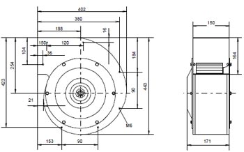 Напряжение электропитания – 400 В. Частота тока – 50 Гц. Максимальная потребляемая мощность электродвигателя – 0.85 кВт. Максимальный рабочий ток –1.75 А. Пусковой ток – 4.73 А. Скорость вращения – 1250 об/мин. Максимальная температура окр. среды – +60°С. Степень защиты – IP54. Масса – 15.5 кг. Цена вентилятора ERAD 279-4