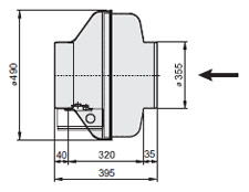 Диаметр входного и выходного патрубков для подсоединения к каналу – 355 мм. Напряжение электропитания – 230 В. Частота тока – 50 Гц. Максимальная потребляемая мощность электродвигателя – 0,61 кВт. Максимальный рабочий ток – 2,6 А. Пусковой ток – 4,68 А. Скорость вращения – 2340 об/мин. Максимальная температура окр. среды - +45°С. Степень защиты – IP54. Масса – 14 кг. Цена вентилятора R 355 L